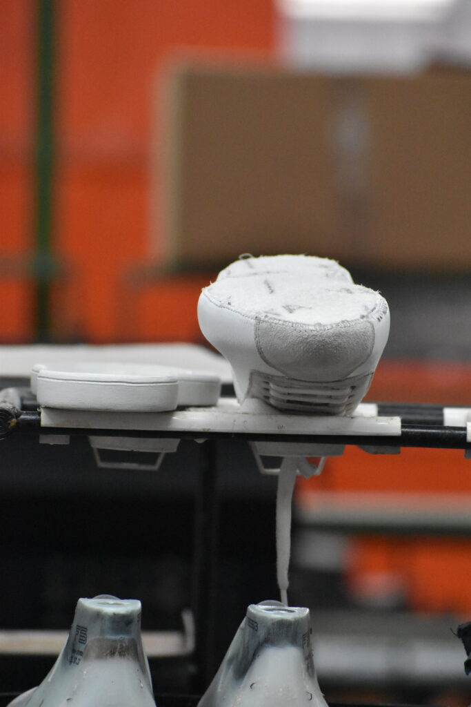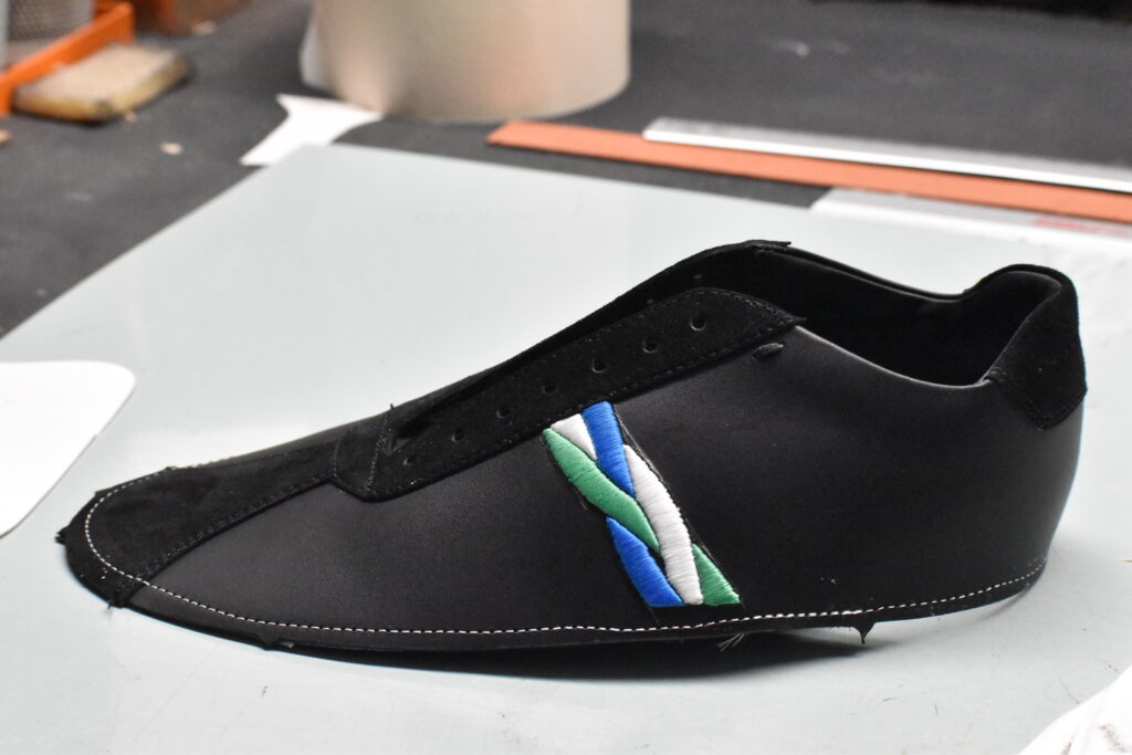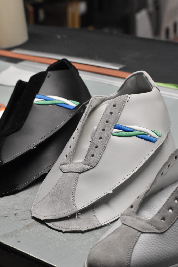 Les différentes pièces découpées sont assemblées pour former la tige, l’enveloppe supérieure de la sneaker.