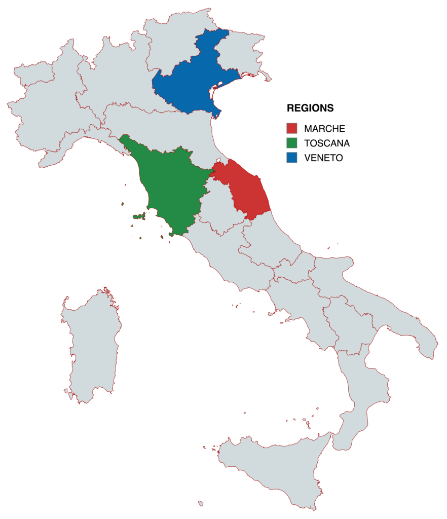 Chaque cuir est travaillé dans une région spécifique d’Italie, selon sa spécialité :