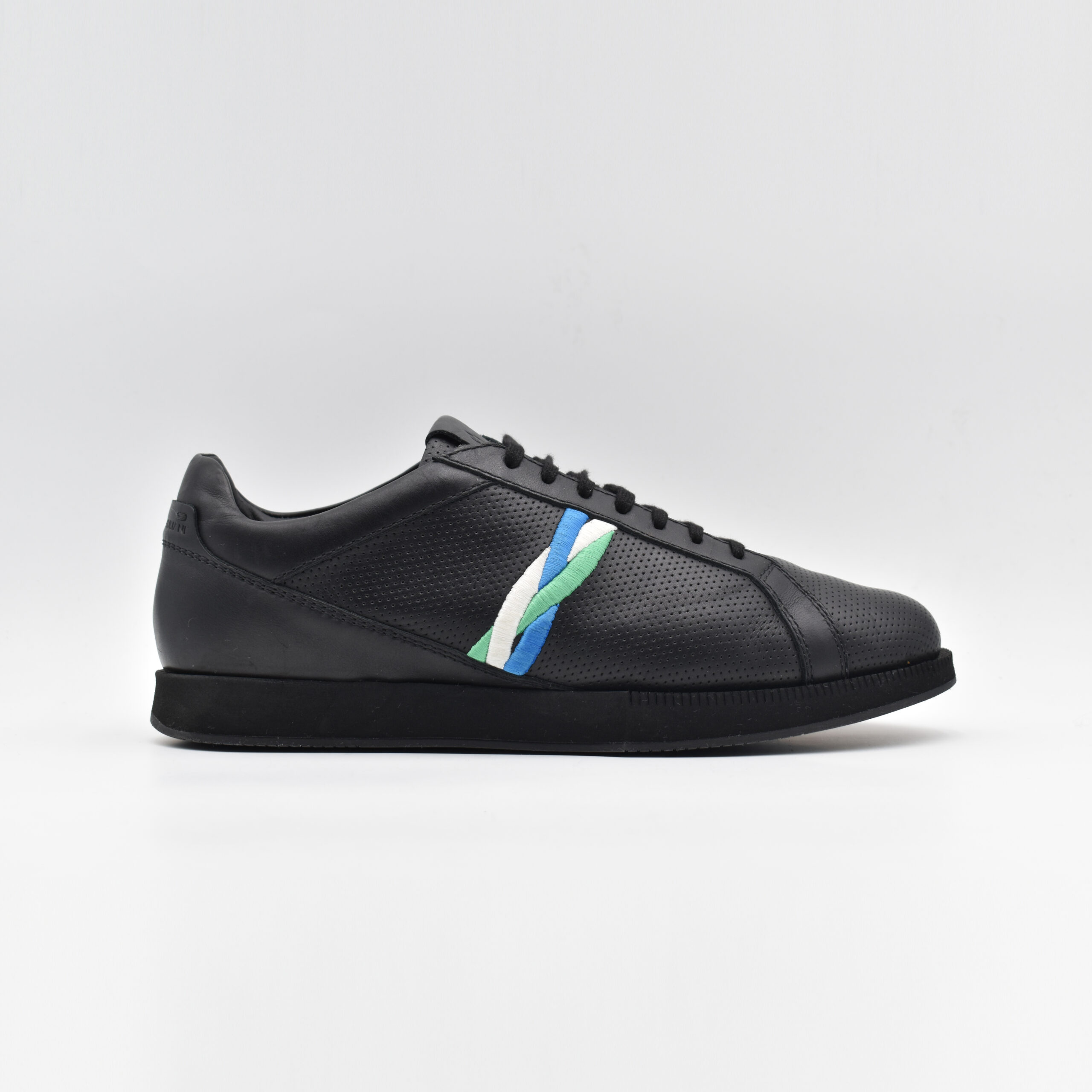 Sneaker basse en cuir de veau lisse et perforé noir, dotée d’une doublure en cuir de veau noir. La tresse brodée tricolore et les deux points de couture ton sur ton à l’arrière témoignent d’un savoir-faire artisanal maîtrisé. Logo MG sur la languette et signature MAISON GIULIANI à l’arrière.